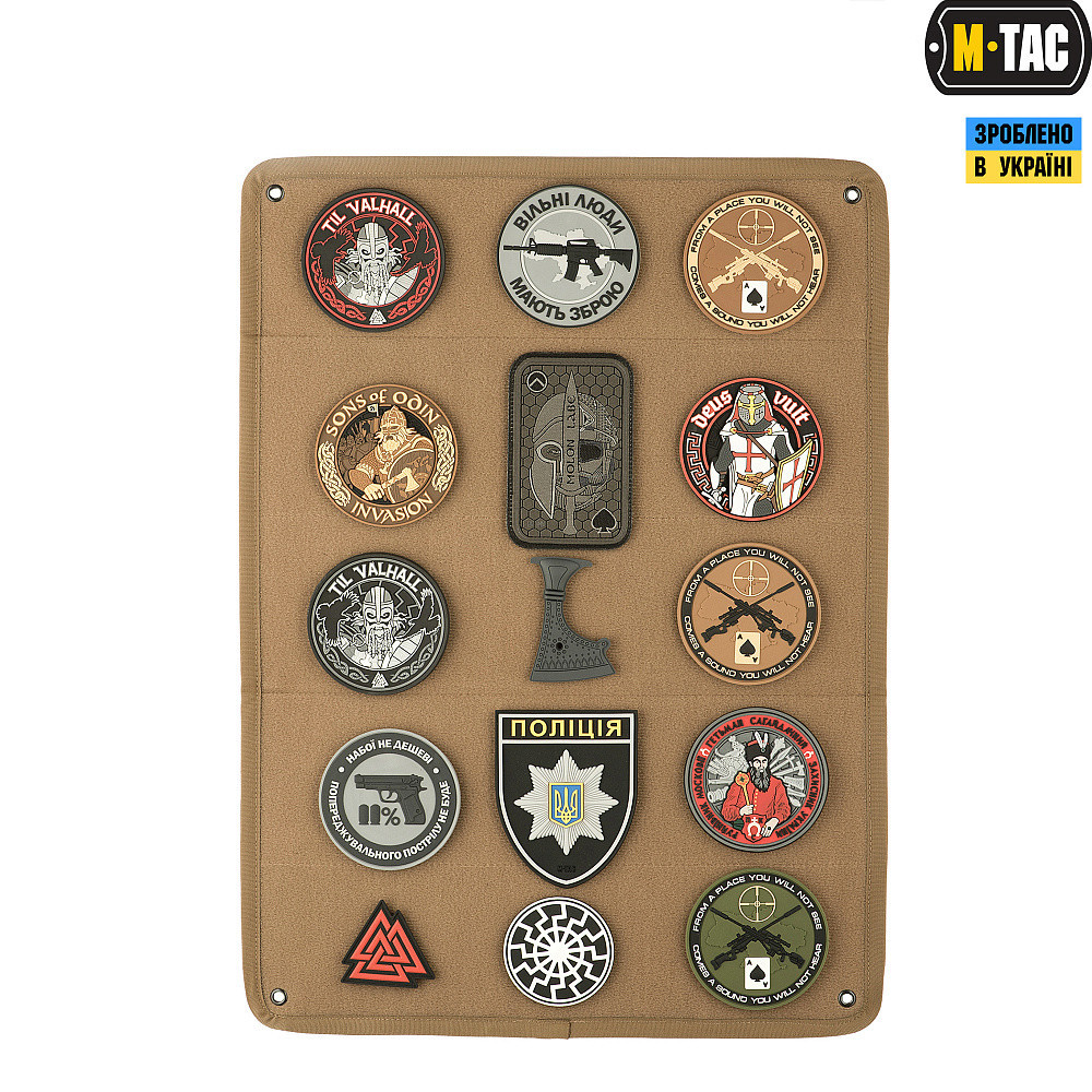 Зручний органайзер M-Tac для зберігання і транспортування Ваших патчів і нашивок. Панель згортається в три складання, і в такому вигляді поміщається в більшість тактичних і міських рюкзаків. У розгорнутому вигляді панель можна підвісити як горизонтально, так і вертикально за допомогою петель з міцного прогумованого матеріалу. А за допомогою строп на кнопках панелі у вертикальному вигляді можна закріпити на будь-якій горизонтальній перекладині невеликого діаметру. Габарити: 35 х 50 см Матеріали: Нейлон 1000D Стропи: Texcel Петлі для підвісу з матеріалу: Hypalon Фурнітура: YKK Особливості: У кожному з чотирьох кутів панелі пробито по люверсу. Протягнувши через них паракорд або мотузку, Ви можете закріпити панель в зручному для вас положенні.
